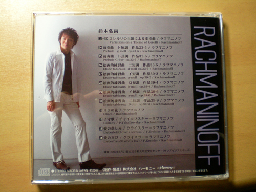 今年の6月に録音された鈴木弘尚さんのCDがいよいよ発売されました。収録曲はすべてラフマニノフです。一曲一曲が本当にきれいな音色と弘尚さんの豊かな感性、そして高度なテクニックとどれをとっても最高の作品です。この録音をとった時の事は6月のレッスン日記に書きましたが、私もこの録音に携わり当時の事を思い出し、どれをとっても一つ一つ丁寧に完璧に時間をかけて録音したことが、こうして素晴らしいCDとなったことが本当に嬉しく思います。あらためてピアノっていいなと思います。是非皆さんも聴いて下さい。あらためてラフマニノフと、そして弘尚さんの偉大さがわかりますよ。お求めは